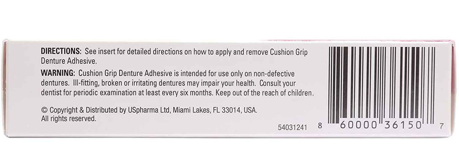 Cushion Grip Denture Adhesive is intended for use only on non-defective dentures. lll-fitting, broken or irritating dentures may impair your health. Consult your dentist for periodic examination at least every six months. Keep out of the reach of children.