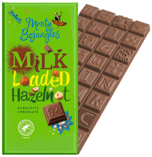 Enjoy Monty Bojangles RFA MILK Loaded Hazelnut Premium Chocolate Bar by unwrapping and consuming directly. Ideal for snacking or as a dessert accompaniment.