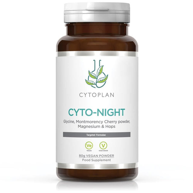 Cytoplan Cyto-night is a carefully formulated vegan powder designed to support restful sleep and promote relaxation naturally. This pleasant-tasting blend combines montmorency cherry, a renowned natural source of melatoninthe body's sleep hormonewith glycine, hops, and magnesium to create a synergistic effect that encourages a calm and peaceful night's rest.