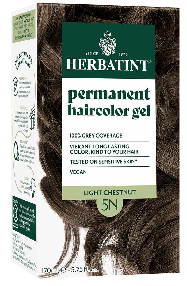 Apply Herbatint Light Chestnut 5N to dry, unwashed hair. Mix the color gel with the activator cream in a 1:1 ratio. Section hair and apply evenly from roots to ends. Leave on for 35 minutes, then rinse thoroughly with warm water until water runs clear.