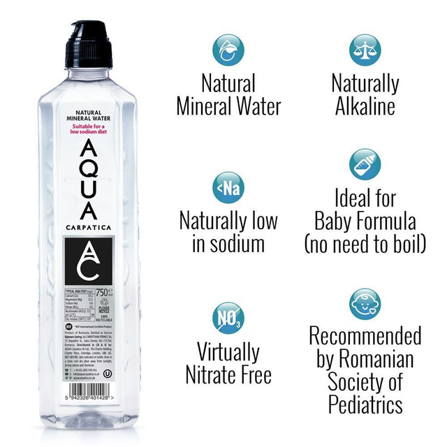 Experience the pure, naturally sparkling freshness of AQUA Carpatica Still Natural Mineral Water, presented in a convenient 750ml bottle with a sports cap for easy hydration on the go. Sourced from pristine Carpathian springs, this still mineral water offers an exceptional balance of minerals, ensuring a clean, refreshing taste with every sip.