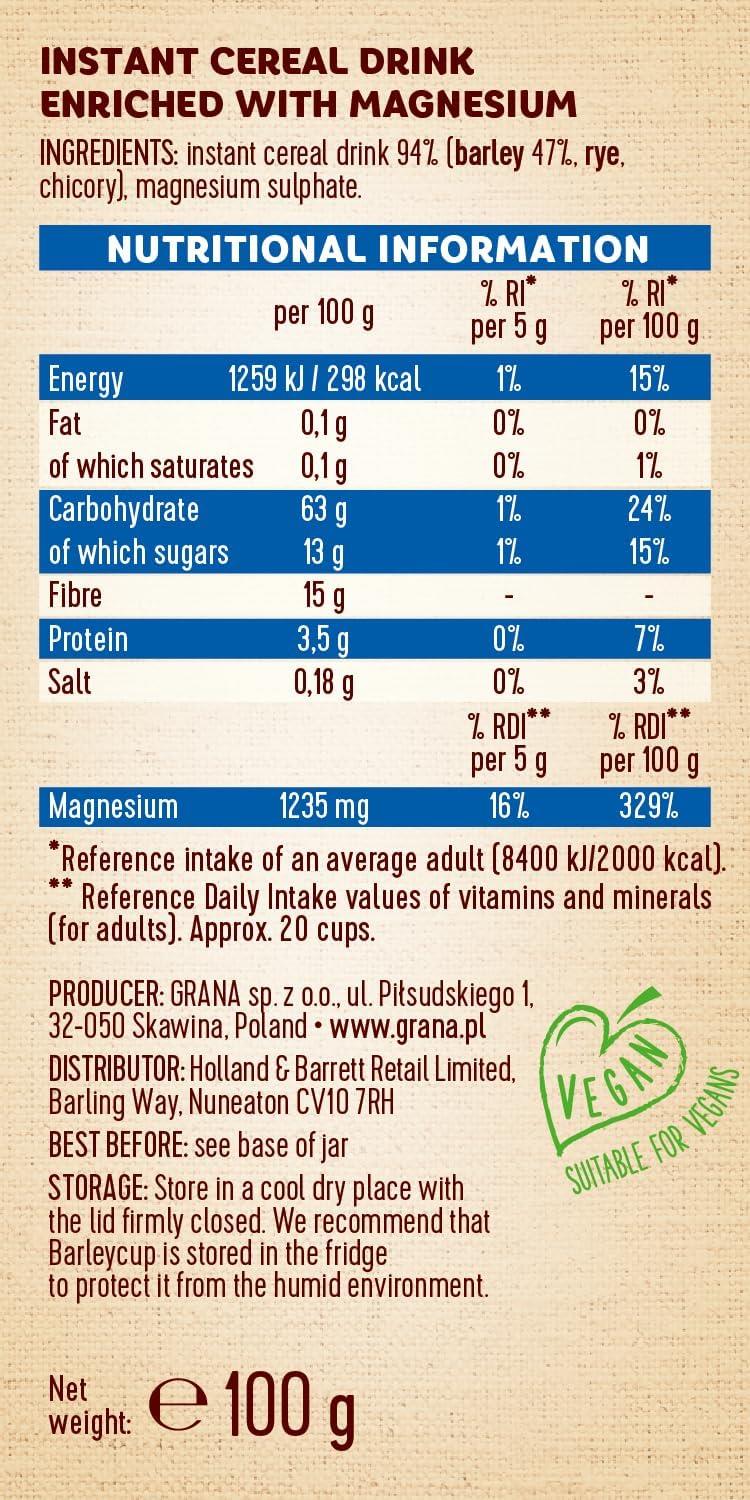 Barleycup with Magnesium 100g is an instant cereal drink enriched with magnesium, offering a deliciously mild coffee taste that you can enjoy every day. Crafted from roasted barley, rye, and chicory, this caffeine-free beverage provides a natural source of fiber, making it a wholesome alternative to traditional coffee.
