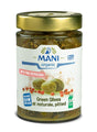 Indulge in the tradition and quality of Mani's organic green olives with pink peppercorns, a deliciously natural choice for culinary enthusiasts seeking authentic Mediterranean flavors and wholesome nutrition.