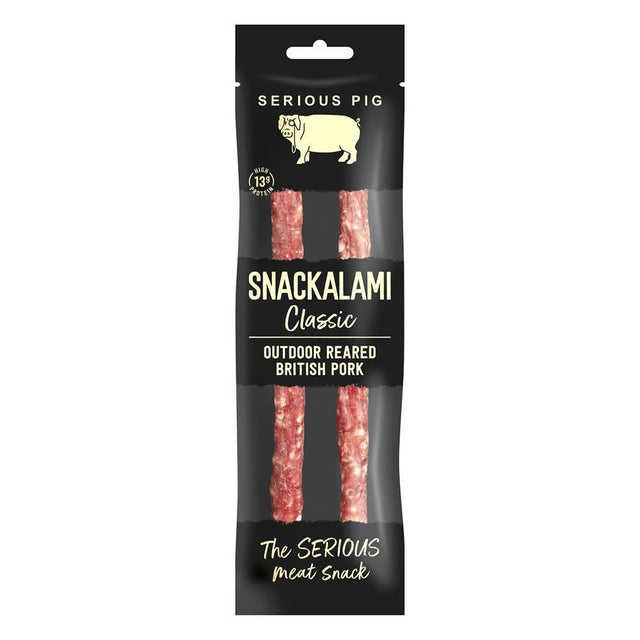 Discover the bold flavor of the Serious Pig Snackalami Classic, a premium snacking salami crafted from outdoor-reared British pork. Each pack contains two sticks of meaty, peppery goodness, delivering a satisfying and protein-packed snack that's perfect for on-the-go enjoyment.