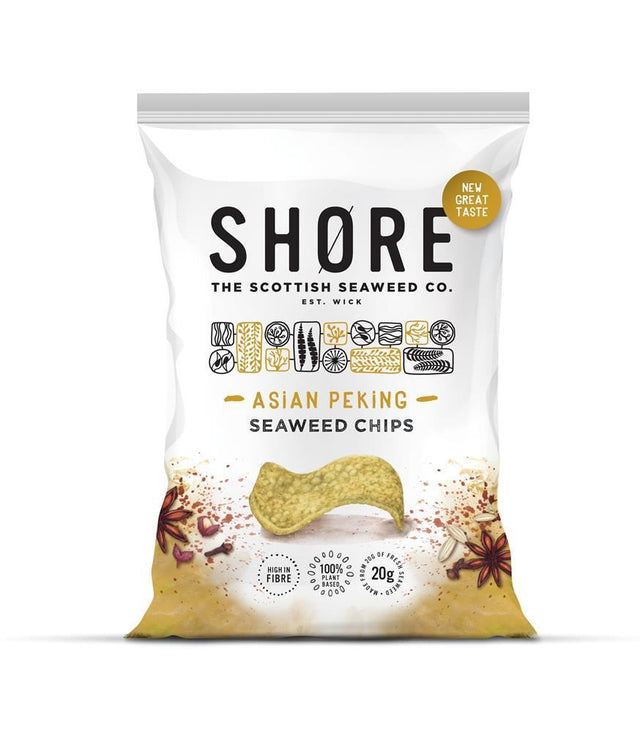 Enjoy Shore Scottish Seaweed Chips - Asian Peking flavor straight from the pack as a crispy, savory snack. Perfect for on-the-go or as a flavorful accompaniment to meals.