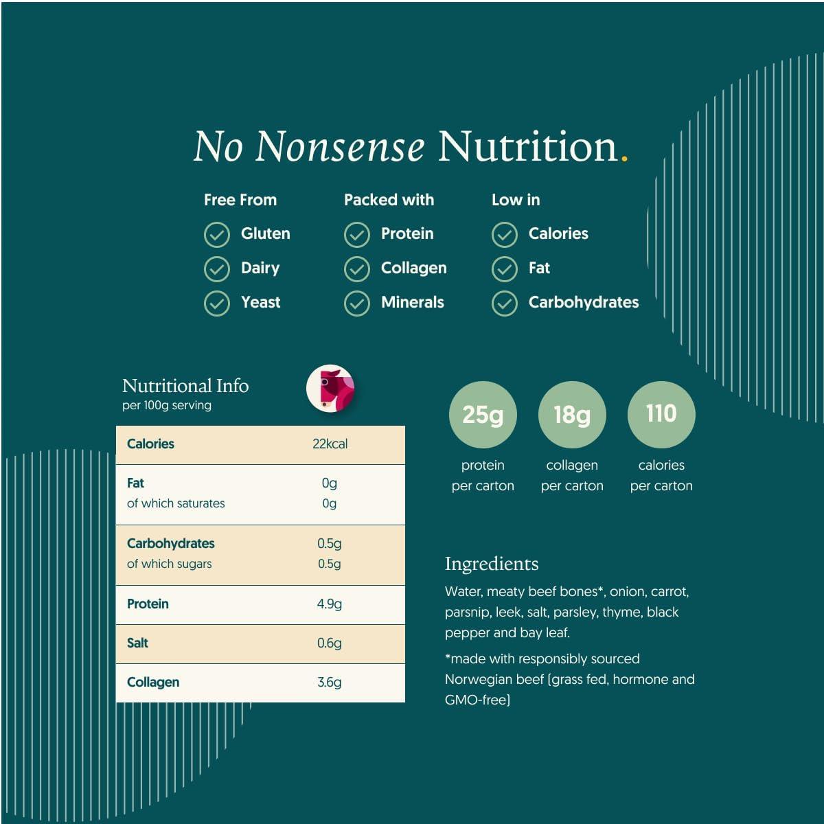 Our commitment to sustainability is reflected in the sourcing of our beef bones from farmers who uphold the highest environmental and animal welfare standards, comparable to British organic requirements. The product is free from antibiotics, hormones, and genetically modified organisms (GMOs). Additionally, the packaging is designed with the environment in mind, using fully recyclable cartons made from 90% renewable materials.