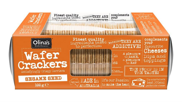 Enjoy Olinas Bakehouse Wafer Crackers Sesame 100g as a crispy snack on their own or paired with cheese, dips, and spreads for added flavor. Perfect for entertaining or casual snacking.