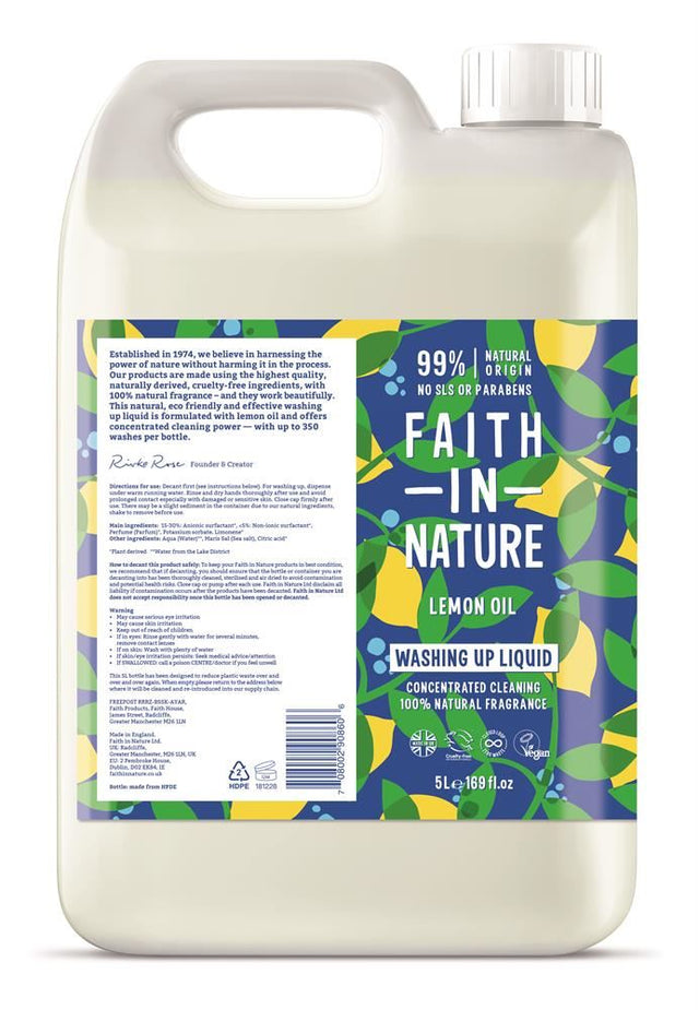 Choose Faith in Nature Lemon Washing Up Liquid 5 Litre for a powerful, environmentally responsible cleaning experience that benefits both your home and the planet.