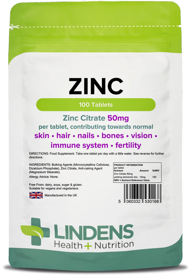 An immensely popular food supplement, due to its great importance within the body, Lindens Zinc Citrate tablets are a great way to make sure you get enough zinc. Zinc contributes to the maintenance of healthy bones, hair, skin, nails, vision, immune function, normal cognitive function, normal reproductive health and healthy fertility. However, our bodies can't produce or store zinc. The only way we can get it is through our diet, and zinc supplementation is a great way to support your nutrition.